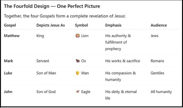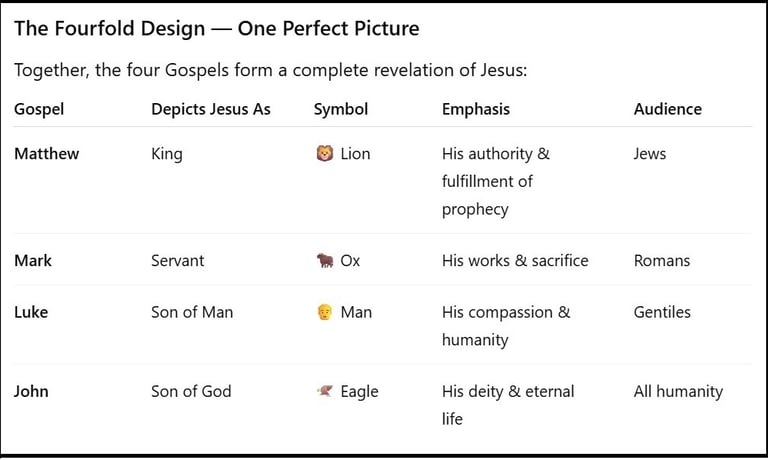 The Gospels are not merely biographies; they are divine revelations of the one Savior in four dimensions — King, Servant, Man, and God. Together they form the complete portrait of Jesus Christ, the fullness of God revealed in human form.