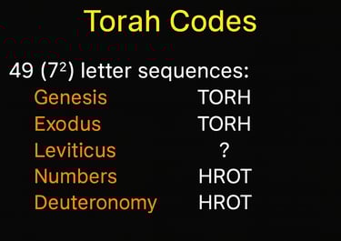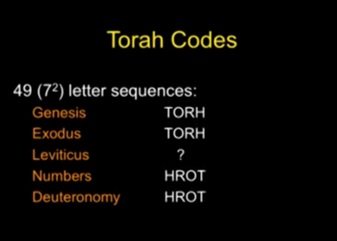 In the Book of Deuteronomy, this same pattern is repeated. Starting at a specific point in the Hebrew text and counting every 49th letter, the sequence once again unfolds in reverse: H–R–O–T—Torah spelled backward.